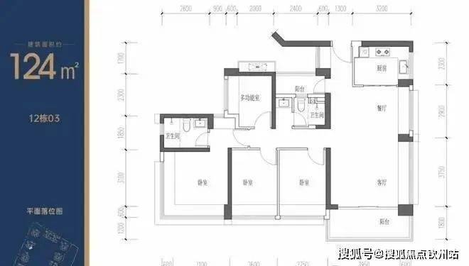124㎡的4房2厅2卫,此户型为东南朝向,设计的是经典竖厅格局,客餐厅位都设计了飘窗,就是为了争取更多的赠送,动静分区,四开间朝南,主卧270°观景飘窗,L型厨房,公卫三段式分离,得房率约88%(包含赠送)。