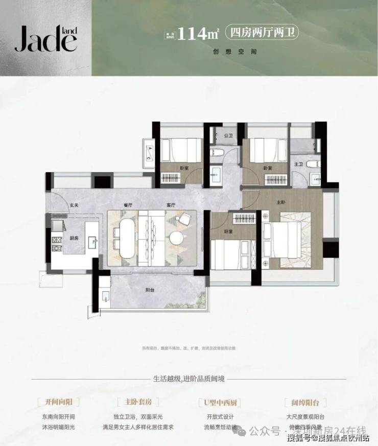 114平㎡的4房2厅2卫,设计的是横厅南北通透格局,进门入户玄关,LDKB一体化,五开间朝南,全屋9面飘窗,主卧大套间,U型厨房,卫生间干湿式分离,得房率约93.18%(包含赠送),阳台主朝东南向。