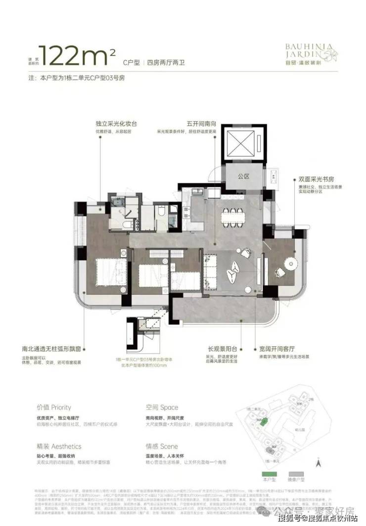122m²四房两厅两卫的C户型:双龙抱珠户型,得房率约92-100%(含赠送),朝向为西南或东南。