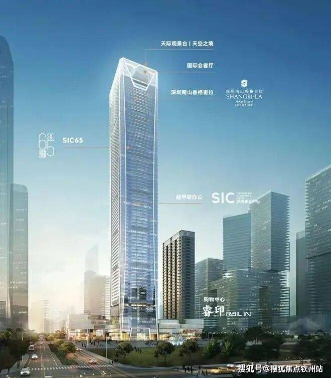 项目共80层,分别布局约8.9万㎡高端商业Mall超深活中心(B2-4F)、约9万㎡超甲级写字楼(5-43F)、约6万㎡ SIC65 办公商务会馆(44-64F)、约3.8万㎡香格里拉酒店(65-78F)四大场域,共同构筑人类在密度建设区域内的垂直空间想象。