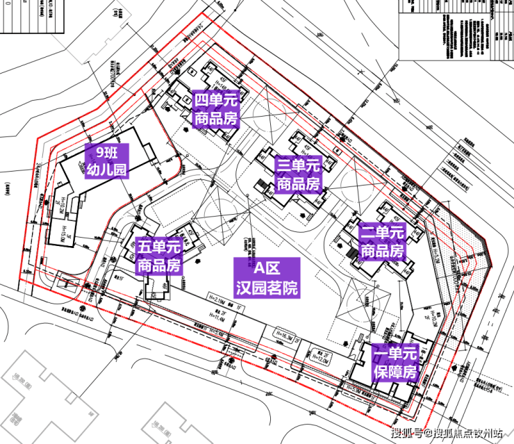 汉园茗院分两个地块A区和B区,A 区是由4栋高层住宅和1栋保障房组成