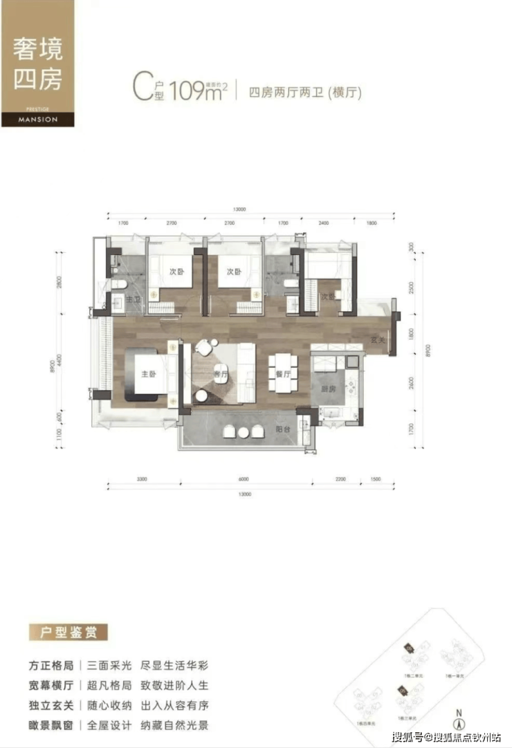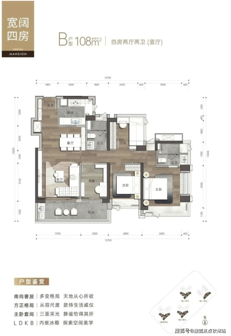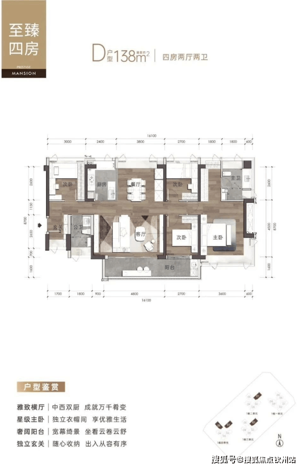 138㎡户型可改造为4+1房,主卧套房设计+6米景观阳台。