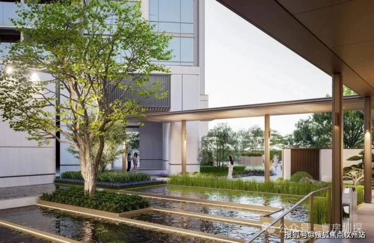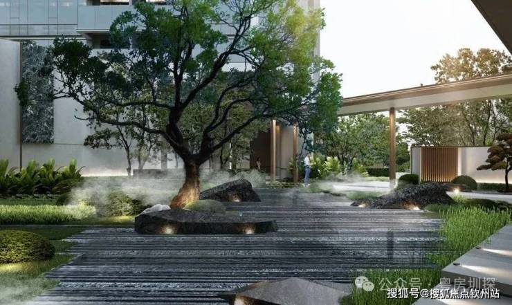 石材景墙+艺术水景+小叶紫檀组景,豪宅级归家体验。