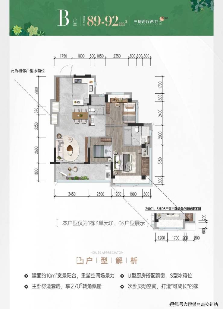 89-92㎡的3房2厅2卫,B户型,设计的是竖厅格局,客厅3.45米开间,LDKB一体化,S墙设计预留冰箱卡槽位,三开间朝南,动静分区,主卧270无边转角飘窗,3个卧室分别做到了主卧18.1㎡/次卧9.44㎡/次卧5.98㎡(包含墙体飘窗),客厅连接次卧出5.75米长的大阳台,U型厨房,公卫三段式分离,得房率约93-99%(包含赠送),西南或东南朝向。