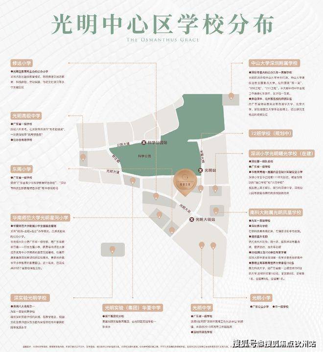 优质小学:项目北侧72班学校(在建,预计24年开始招生)、光明小学、深圳小学光明曙光学校(在建,预计24年开始招生)、华师大附小等
