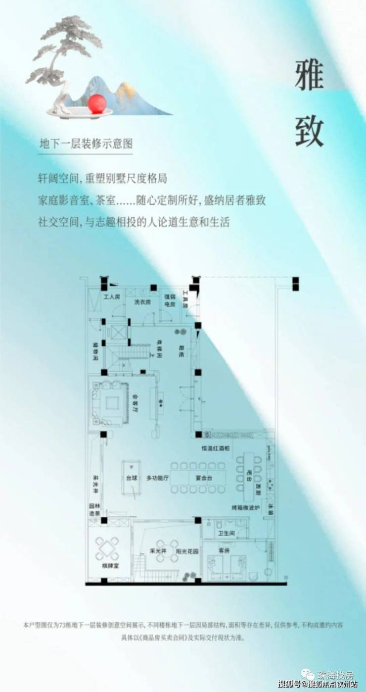 依地势抬高,地下一层相当于地面首层,阶梯相接的天井设计,负一层采光全明,形成稀缺的阳光双首层格局,避免潮湿与漏水,保护尊驾与收藏品。