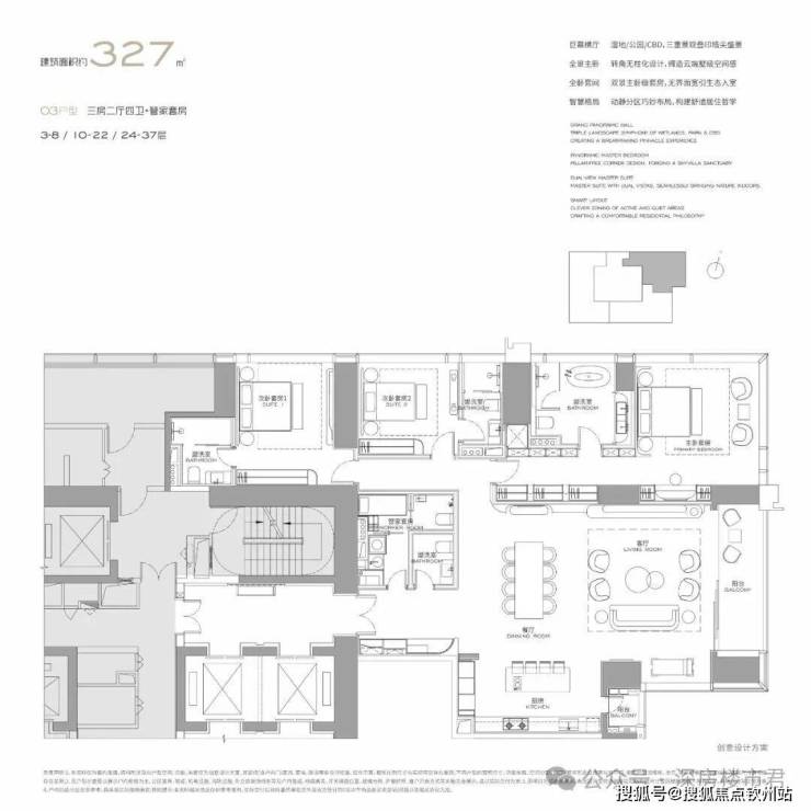 南北通透三面采光,顶奢总统套房规格,270°全景套房,享受湿地/公园/CBD景观,都是套房设计,更具私密性,中西厨分离。