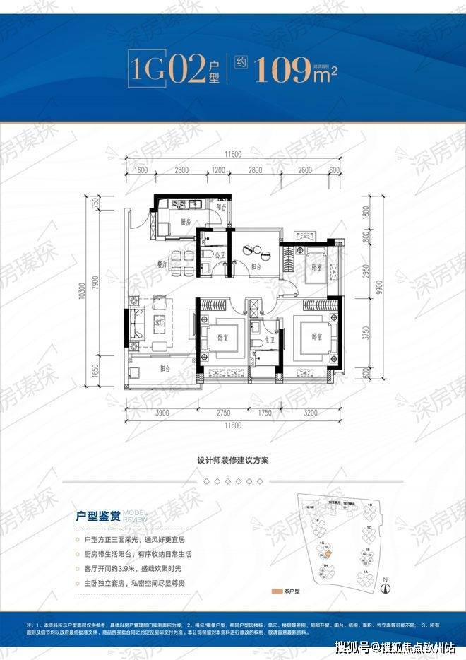 109m²的4房2厅2卫,1G栋02户型,设计的是经典竖厅格局,客厅3.9米开间,LDKB一体化设计,四开间朝南,动静分区,4个卧室分别做到了主卧15.55m²/次卧11.96m²/次卧9.44m²/次卧7.7m²(包含墙体飘窗),得房率79.6%(不含赠送),U型厨房,卫生间干湿分离,阳台6.43m²东南朝向看花园。套内面积87.19m²+赠送面积14.41m²=实用面积101.6m²,加上赠送后得房率92.73%。