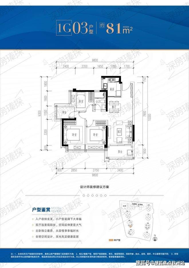 81m²的3房2厅2卫,1H栋03户型,设计的是经典竖厅格局,客厅3.4米开间,LDKB一体化设计,三开间朝南,动静分区,3个卧室分别做到了主卧11.53m²/次卧9.9m²/次卧5.88m²(包含墙体飘窗),得房率76.1%(不含赠送),U型厨房,卫生间干湿分离,阳台4.42m²西南朝向。套内面积61.85m²+赠送面积9.64m²=实用面积71.49m²,加上赠送后得房率87.91%。
