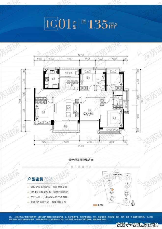 135m²的5房2厅2卫,1G栋01户型,设计的是竖厅南北通透格局,客厅4.2米开间,客餐厅分离设计,四开间朝南,南北双阳台,5个卧室分别做到了主卧18.03m²/次卧11.55m²/次卧11.52m²/次卧9.26m²/次卧8.54m²(包含墙体飘窗),得房率79.6%(不含赠送),U型厨房,卫生间干湿分离,阳台7.14m²东南向看花园。套内面积107.35m²+赠送面积21.81m²=实用面积129.16m²,加上赠送后得房率95.73%。