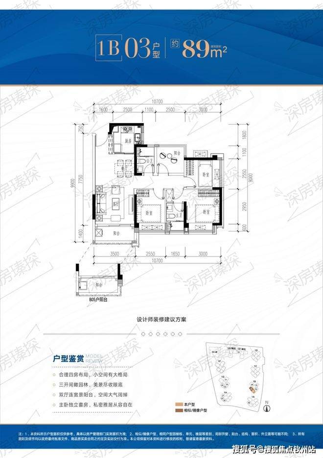 89m²的4房2厅2卫,1B栋03/05户型,设计的是经典竖厅格局,客厅3.5米开间,LDKB一体化设计,四开间朝南,动静分区,4个卧室分别做到了主卧12.18m²/次卧9.05m²/次卧7.65m²/次卧6.37m²(包含墙体飘窗),得房率78.4%(不含赠送),U型厨房,卫生间干湿分离,阳台4.9m²西南朝向看花园。套内面积70.55m²+赠送面积12.45m²=实用面积83m²,加上赠送后得房率92.26%。