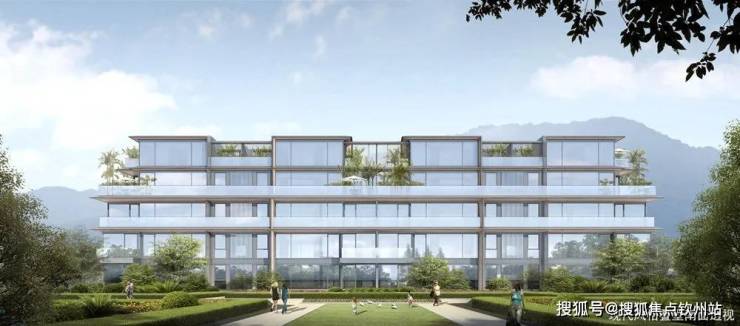 现代风格多层叠拼住宅,采用多种极其现代的材料语言,大面积玻璃窗,横向展开大露台和灰空间,强调水平舒展性,同时衍化出平屋顶和坡屋顶两种风格进行错落变化,靠近北侧已建坡屋顶多层别院住宅的是坡屋顶叠拼,靠近山体的采用更现代感的平屋顶叠拼。