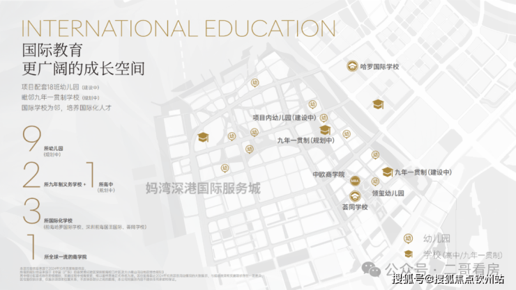 3所国际学校:前海哈罗国际学校、深圳前海国王国际、荟同学校步行10分钟可达。