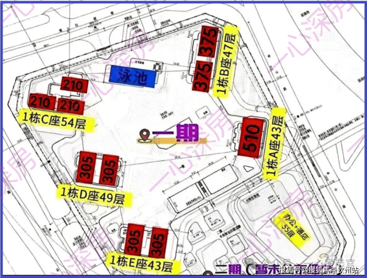 项目一期共5栋超高层住宅,提供约419-422套住宅,为纯大户型社区