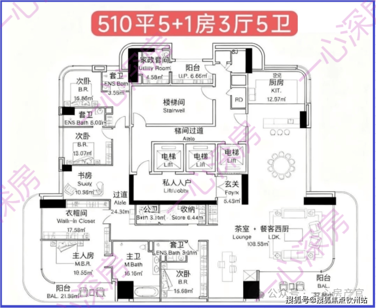 1A栋(1栋一单元)-43层:3梯1户,约510㎡,一层一户,私密性极致,为项目旗舰户型。