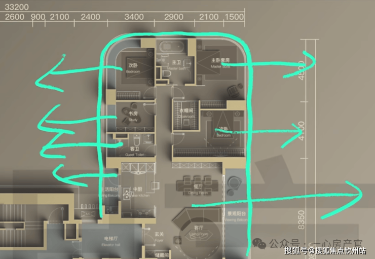 3、210㎡,有两户不好: 只有西南户是最好的,其他两户都不行,东南户虽说高层看海景,但是北侧的中厨、客卫、书房、次卧全部朝北对着墙面,并且飘窗为了和北侧在一水平面上,也做成了L型的直角。北侧的210户型,海景看到的景观面就不多了,但是给了两部电梯。