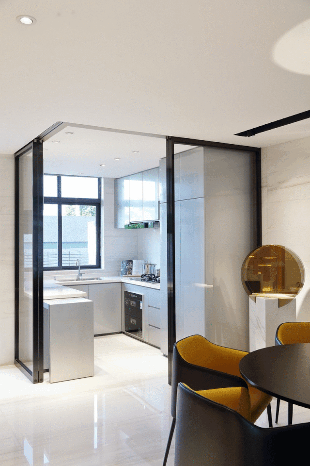 餐厅一侧的厨房采用了推拉门进行隔断,烹饪时关上门,油烟不轻易跑出厨房,平时可以打开门进行通风。