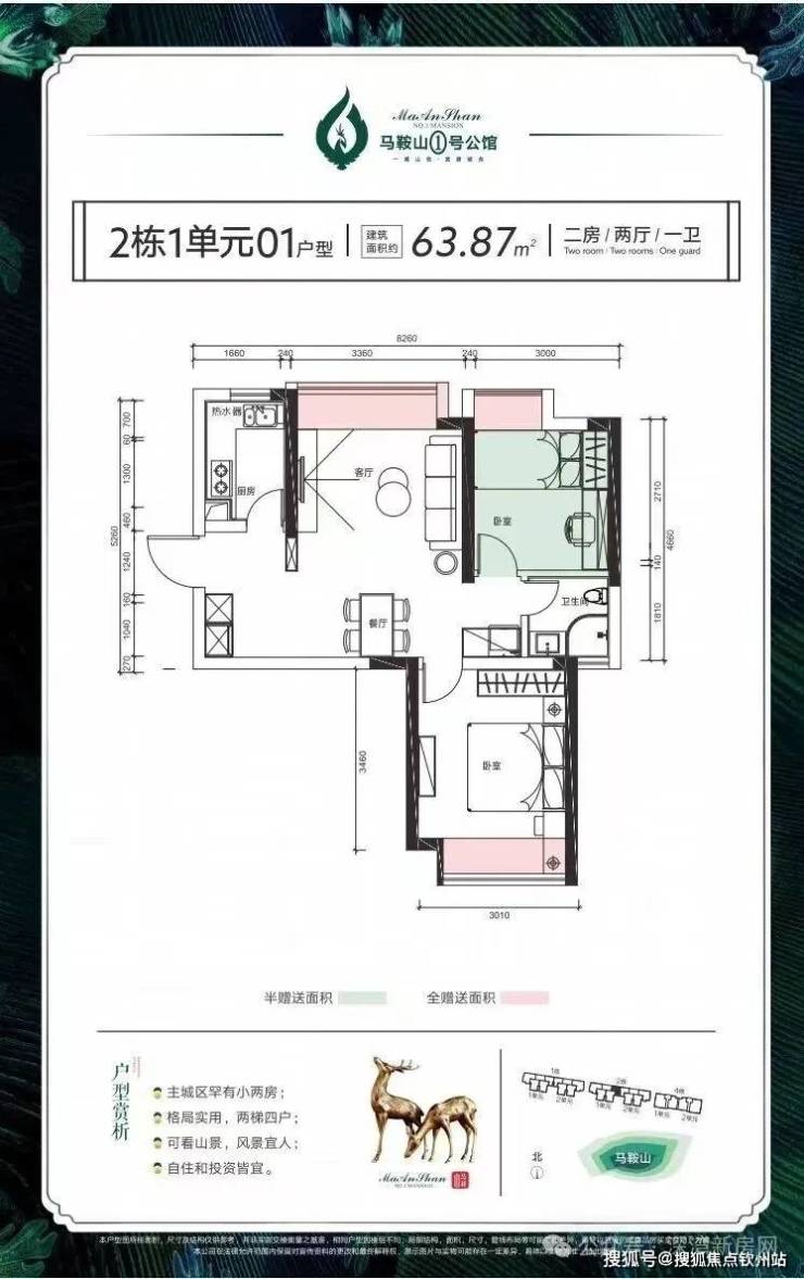 01户型:63.87平米 2*2*1 均价:23280 元 南北通透