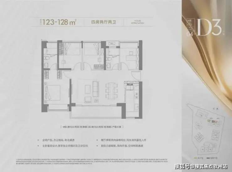 123-128㎡的4房2厅2卫,设计的是横厅南北通透格局,进门入户玄关,客餐厅6.6米开间,LDKB一体化设计,四开间朝南,主卧套房设计,6.6米超长观景阳台,U型厨房,卫生间干湿分离,得房率约72.45%(不含赠送),阳台主朝正南向。