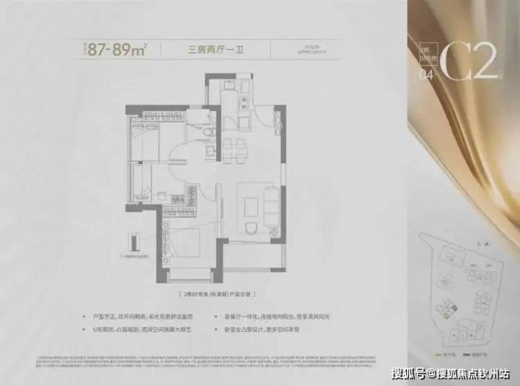 87-89㎡的3房2厅1卫,设计的是竖厅格局,进门入户玄关,客厅3.35米开间,LDKB一体化设计,进深7.2米,U型厨房,卫生间三段式分离,得房率约72.28%(不含赠送),西南或东南朝向。
