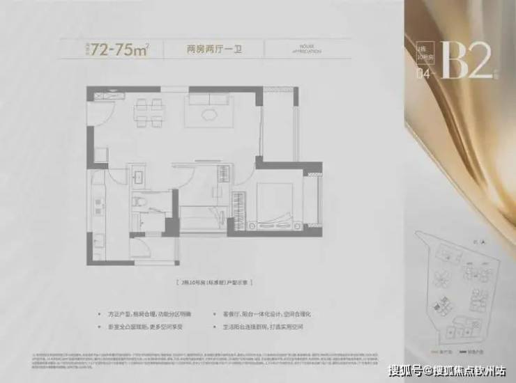 72-75㎡的2房2厅1卫,设计的是竖厅格局,客厅3.2米开间,LDKB一体化设计,进深7.2米,一字型厨房还带1个生活阳台,卫生间三段式分离,得房率约72.28%(不含赠送),西南、东南或东北朝向。