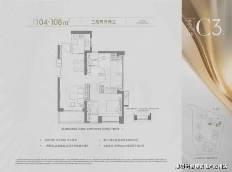 104-108㎡的4房2厅2卫,设计的是竖厅格局,进门入户玄关,客厅3.6米开间,LDKB一体化设计,进深8.7米,S墙设计预留冰箱卡槽位,三开间朝南,主卧套房设计,U型厨房,公卫三段式分离,得房率约72.45%(不含赠送),正南或正东朝向。