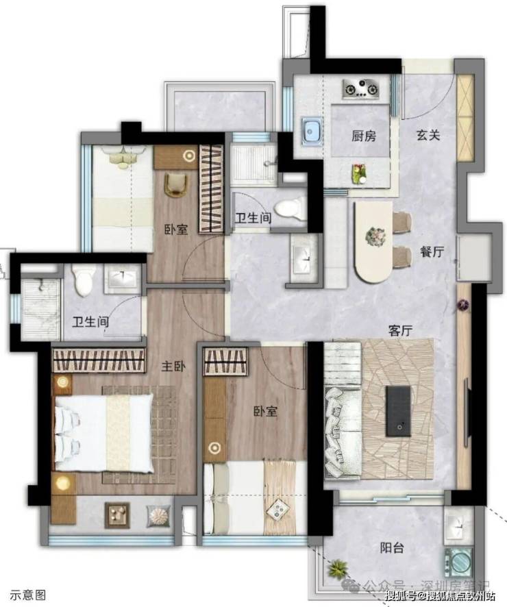 86㎡三房两卫:总价286-355万。经典竖厅格局,客厅3.2米开间,动静分区,三开间朝南,U型厨房,公卫三段式分离,还送一个设备平台。这个户型改善属性更强,两卫设计也更方便。西南或东南朝向。