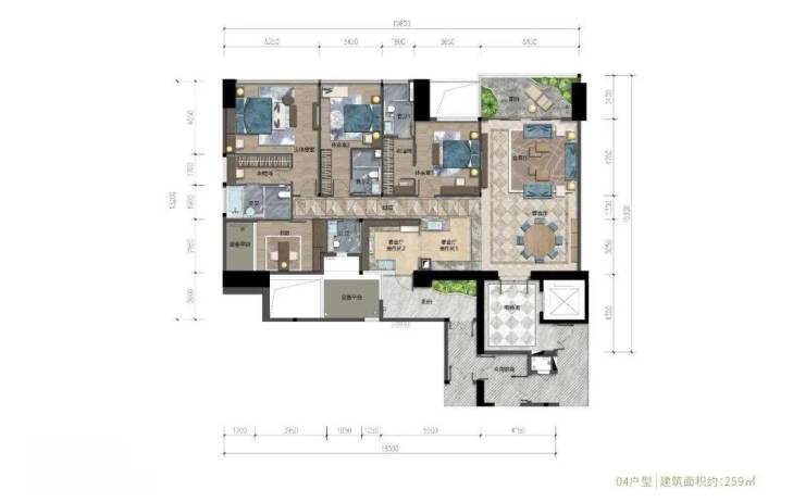 以最小面积的259平户型图为例,承重墙为户型图中的黑色部分,多分布在入户及边角位置。