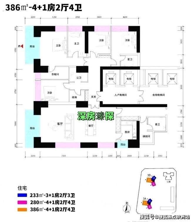 386㎡的4房2厅3卫+家政套间,仅3栋A/B座C户型,双梯入户,设计的是竖厅格局,客厅5.8米开间,LDKB一体化设计,双阳台,主卧大套间约31㎡,次卧套间约15.5㎡(不含卫生间),次卧约17.81㎡/12.96㎡/7.36㎡,另外还有保姆套房,L型厨房,得房率约78-82%(包含赠送),约12.76㎡观景大阳台,正西朝向,看高尔夫景观。