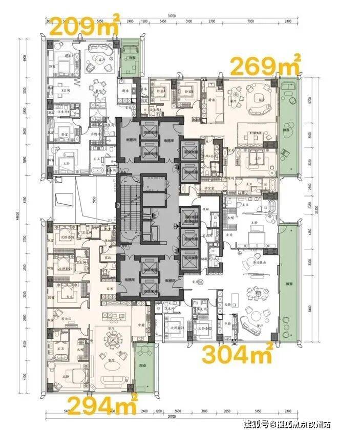 中低区(5-39F),约209-304㎡四房三卫: