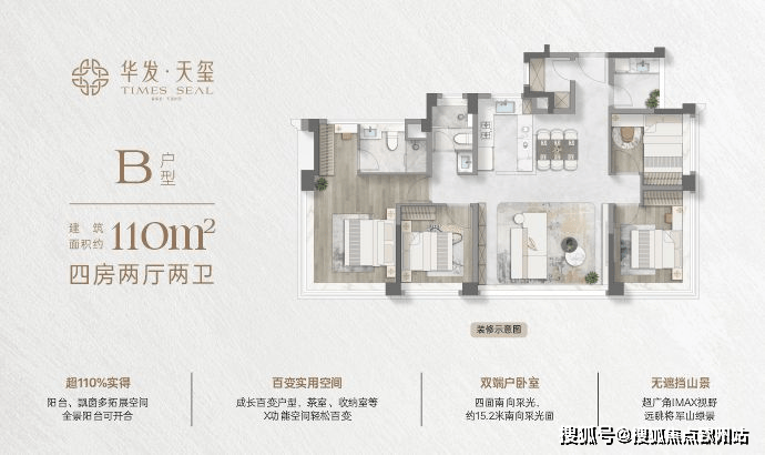 约110㎡四房两厅两卫:约16米通风面,户户是端户;约28㎡行政级端卧套房,270°景观视野,360°环统式采光