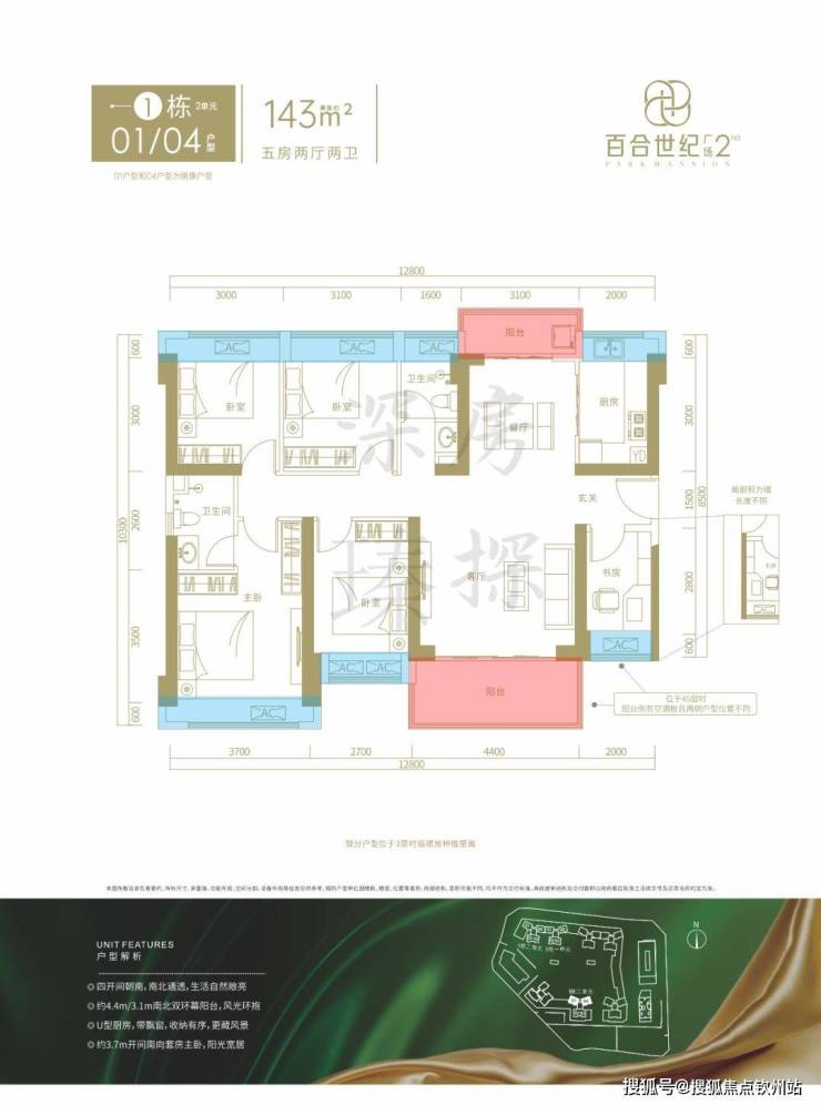 143㎡的5房2厅2卫,3栋1单元04/3栋2单元01户型,设计的是竖厅南北通透格局,进门入户玄关,客厅4.4米开间,客餐厅分离设计,南北双阳台,四开间朝南,4个卧室分别做到了主卧17.77㎡/次卧11.16㎡/次卧10.8㎡/次卧10.8㎡/次卧6.8㎡(包含墙体飘窗),U型厨房,卫生间干湿分离,得房率约76.9%(不含赠送),阳台主朝西南或东南向。套内面积109.52㎡+赠送17.22㎡=实得126.74㎡,加上赠送得房率约88.94%。