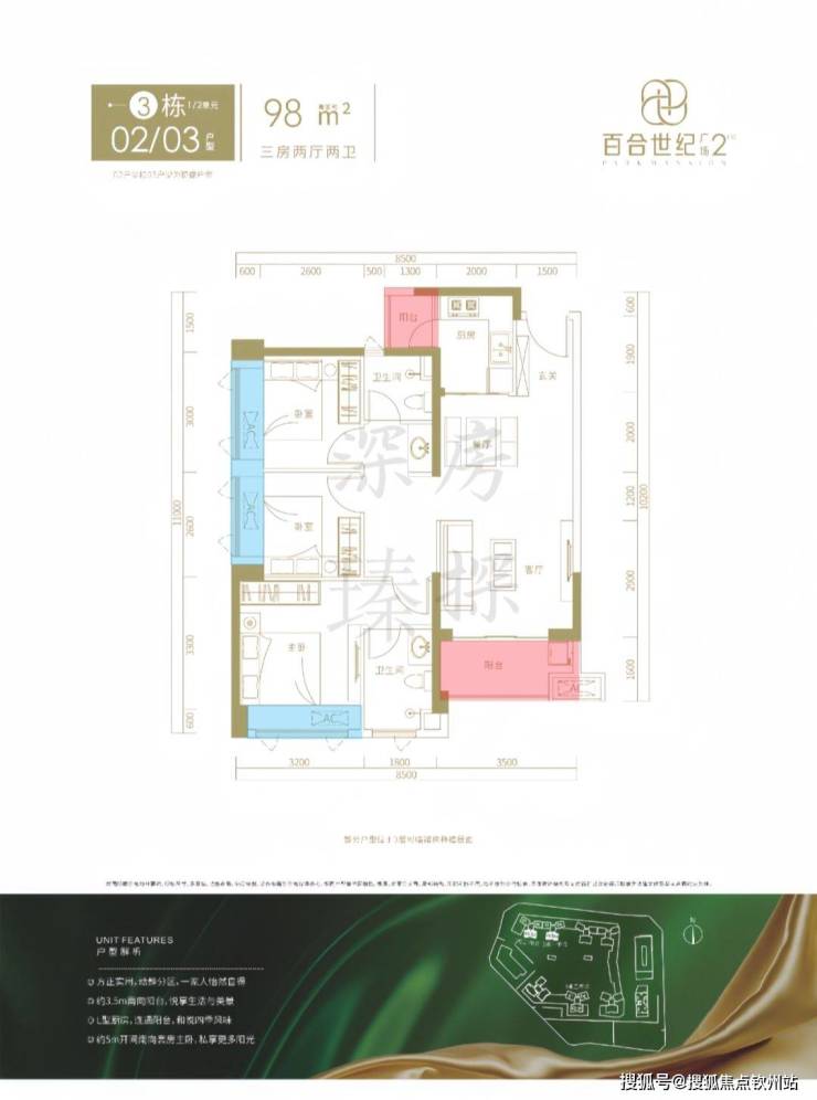 98㎡的3房2厅2卫,3栋02/03户型,设计的是竖厅格局,进门入户玄关客厅3.5米开间,LDKB一体化设计,三开间朝南,动静分区,3个卧室分别做到了主卧14.46㎡/次卧9.6㎡/次卧8.32㎡(包含墙体飘窗),L型厨房带1个生活阳台,公卫三段式干湿分离,得房率约76.2%(不含赠送),正南朝向。套内面积74.69㎡+赠送9.05㎡=实得83.74㎡,加上赠送得房率约85.46%。