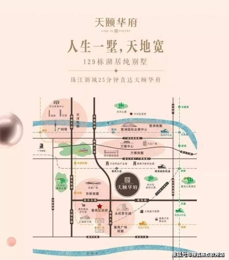 天颐华府所处番禺广场板块,可快速到达珠江新城。项目利用原始的地形空间,环绕 湖景摆布呈现出柔美的弧度,打造具有归属感的私密居住空间,有且只有128席稀缺城央湖居纯墅,拥有纯粹 圈层。