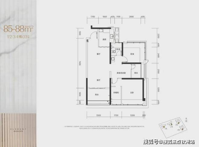 85-88㎡的3房2厅2卫,1/2/3/4栋02.03户型,设计的是竖厅格局,客厅3.5米开间,LDKB一体化设计,三开间朝南,3个卧室分别做到了主卧13.43㎡/次卧9.78㎡/次卧6.85㎡(实测面积,去掉墙体),L型厨房,公卫三段式分离,得房率约100-102.68%(包含赠送),东南或西南朝向。