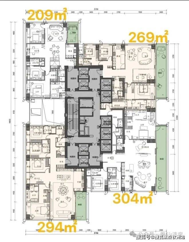 【户型面积】低区209-294-269-304㎡,高区370-375-403㎡,超高区500平-700平-1050㎡