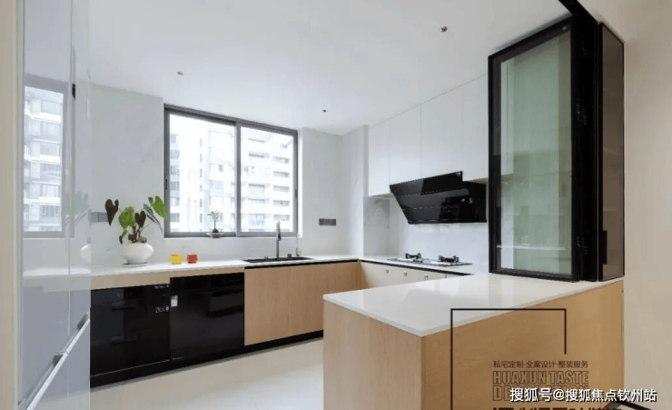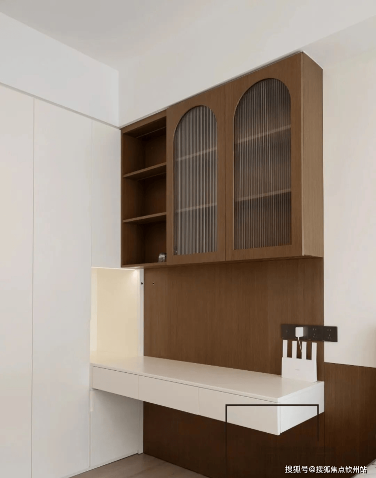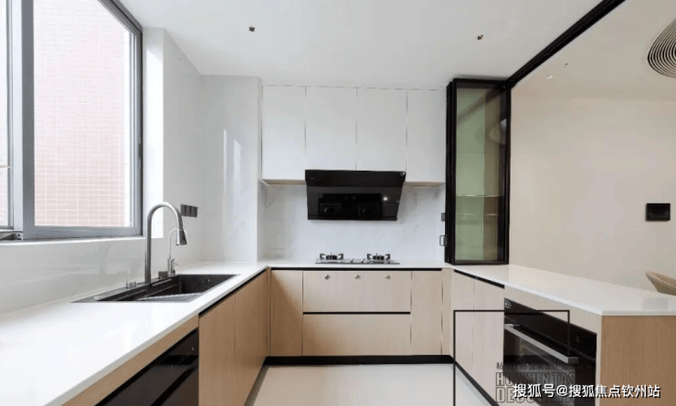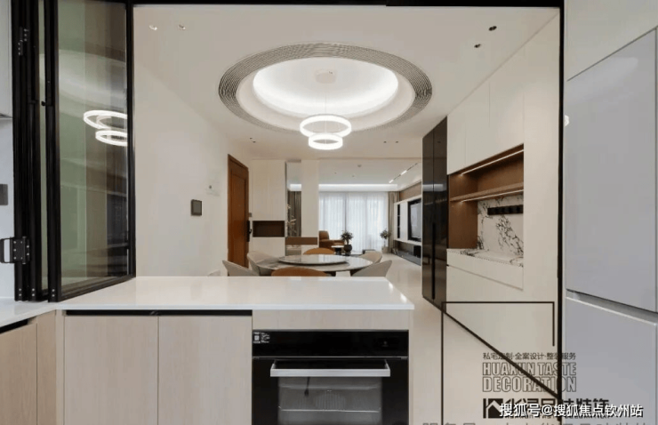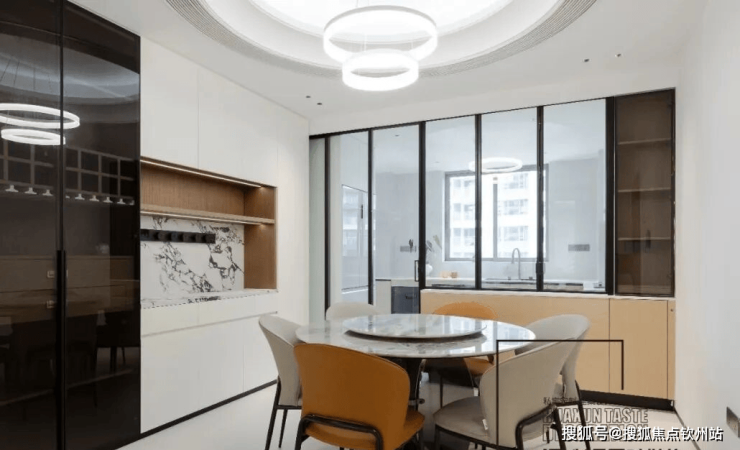 餐厨关系是本案的另一亮点。玻璃推拉门有效区隔了空间,却未阻断光与视线的流通。厨房内部遵循高效的L型动线,浅木色橱柜与白色台面、嵌入式黑色厨电的组合,在满足强大功能性的同时,保持了视觉上的绝对清爽与高级感。