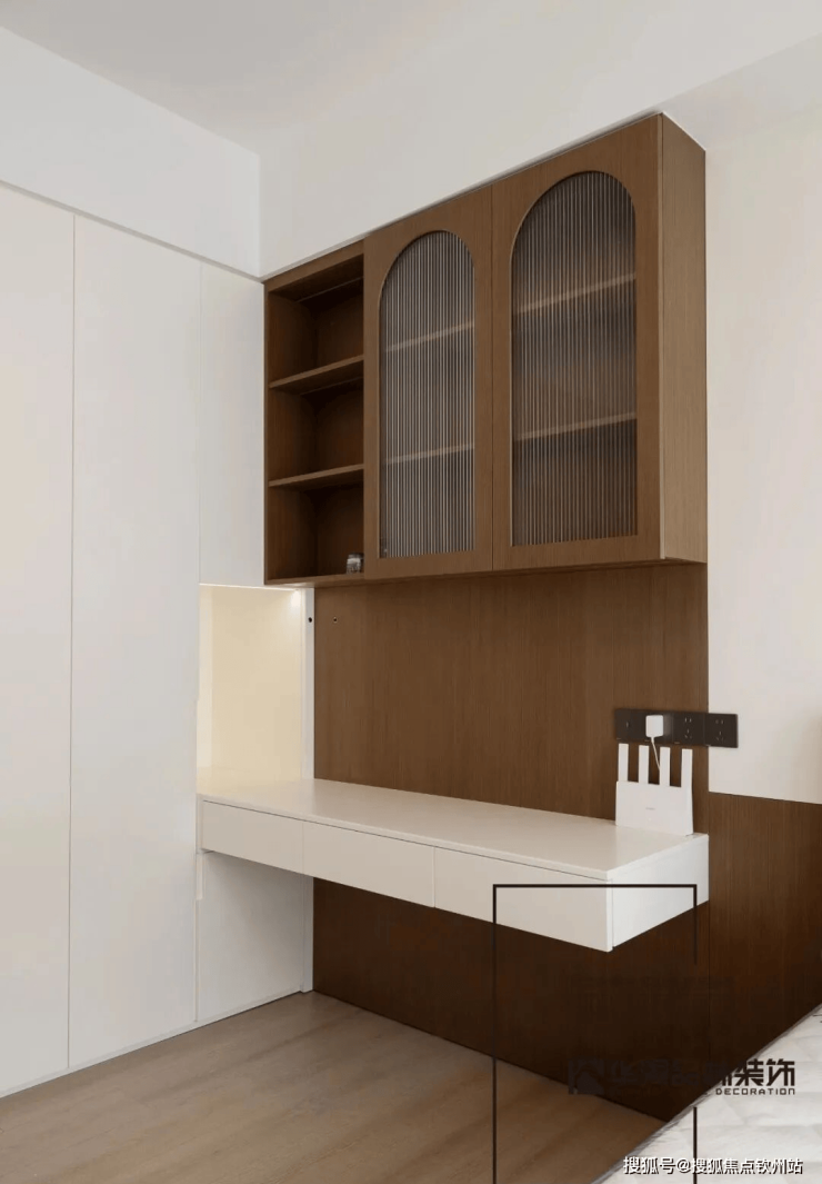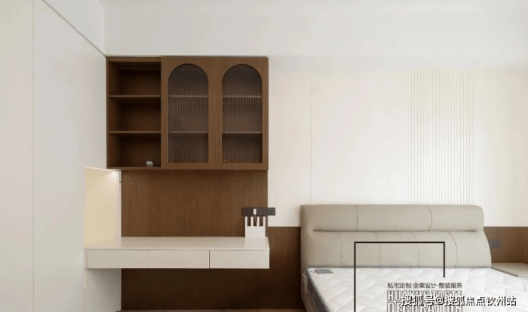赋予空间妥帖的舒适感,线条简洁利落。一侧的深棕色木质玻璃门置物架既可作为展示收藏品的心爱角落,也避免了空间的压抑感。整体配色沉稳和谐,营造出有助于安眠的静谧环境。