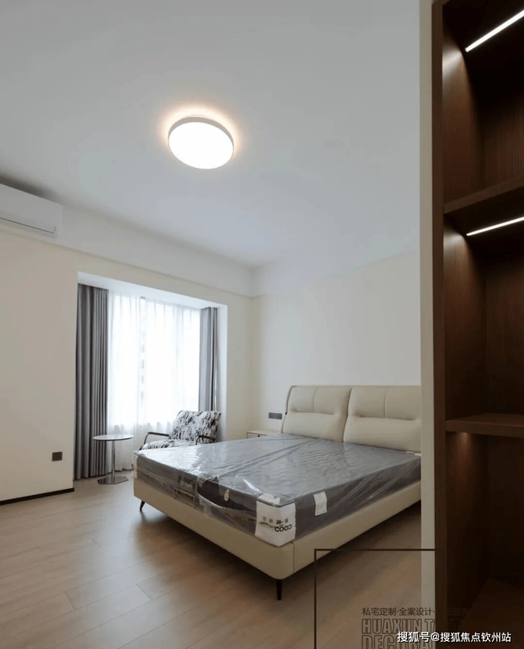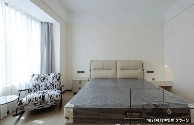 主卧室延续了公区的纯净色调以白色和米色营造出宁静、舒缓的休憩氛围。