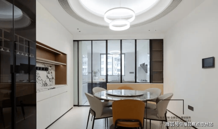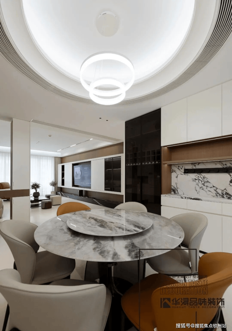 餐厅与客厅无缝衔接,延续了整体的简约语汇。圆形大理石餐桌能更好地聚合家庭成员,上方悬浮的双环吊灯不仅提供了柔和照明,其独特的造型本身也成为视觉焦点。特意选配的两把灰橙色餐椅,成为空间中的一抹亮色,活跃了用餐氛围。