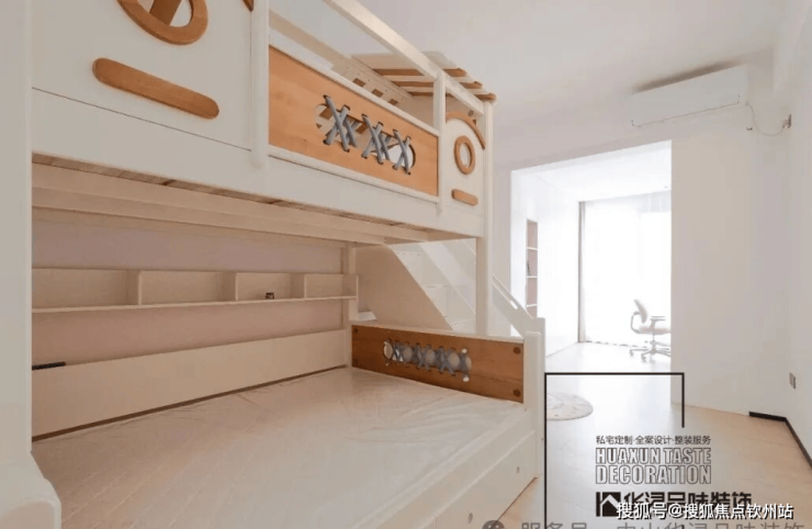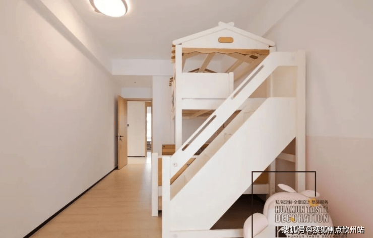 白色与木色相间的双层床不仅充满童趣,更高效地利用了垂直空间,为孩子的成长与互动提供了可能。清新的色调、安全的圆角处理与开放式储物格,共同打造了一个兼顾美观、安全与实用的成长天地。