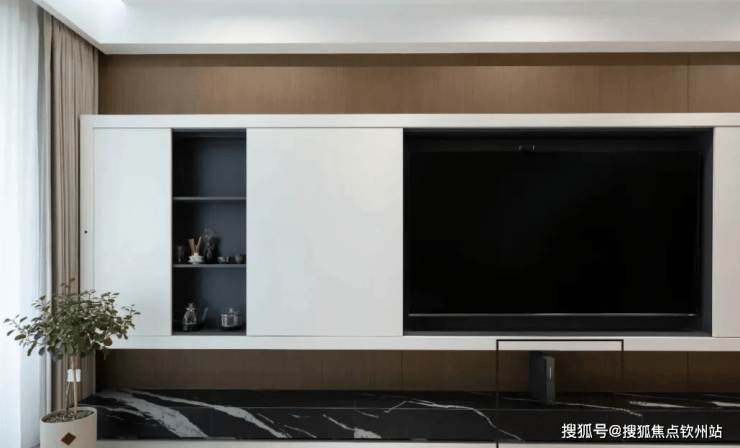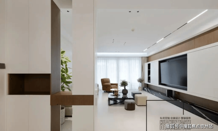 设计重点在于电视墙的处理。我们采用了整墙式定制收纳柜,将电视机完美嵌入。白色的柜体保持了立面的极度整洁,局部穿插的深木色开放格则打破了单调,兼具展示与储物功能,真正实现了“简于形,纳于内”。