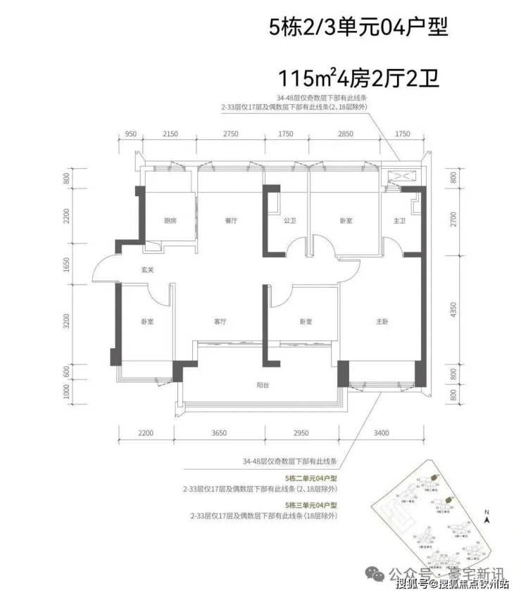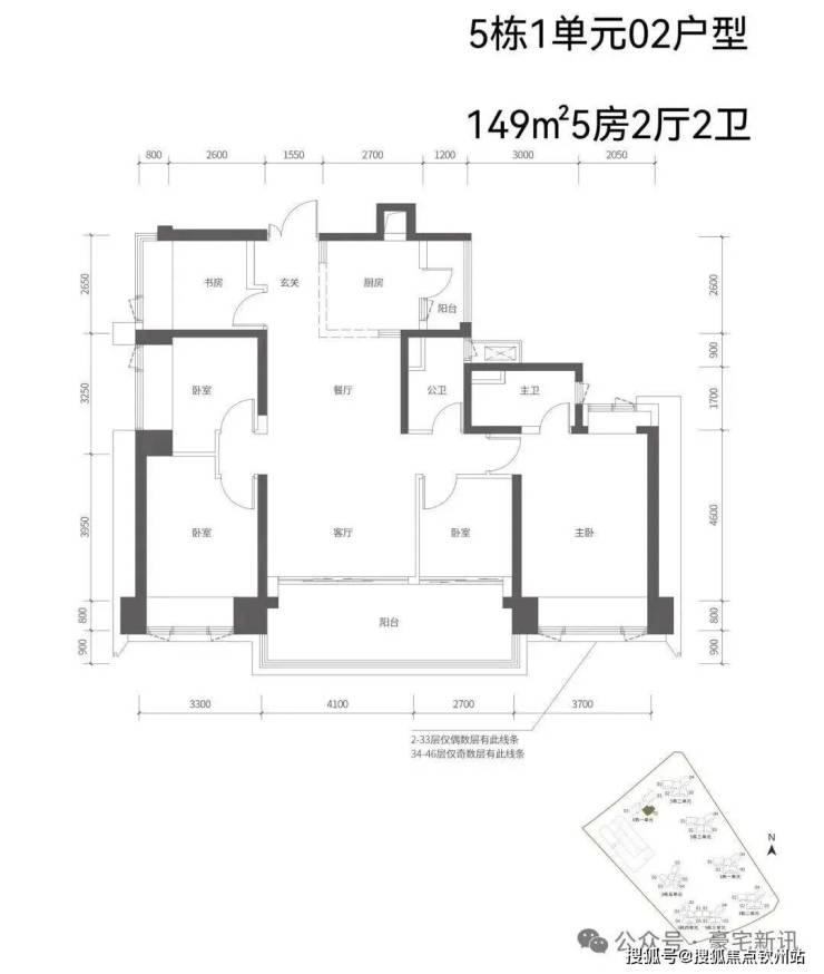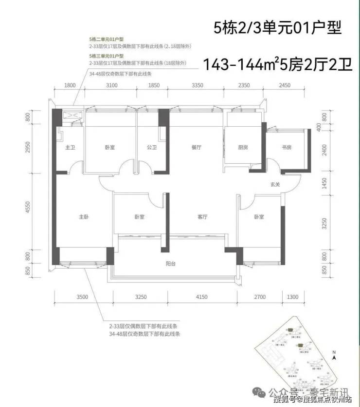 【五栋三单元-平面图】3梯4户,4条腿,跟二单元的户型产品一模一样,01号房户型约144㎡的5房2厅2卫,02、03号房户型约96㎡的3房2厅2卫,04号房户型约115㎡的4房2厅2卫。