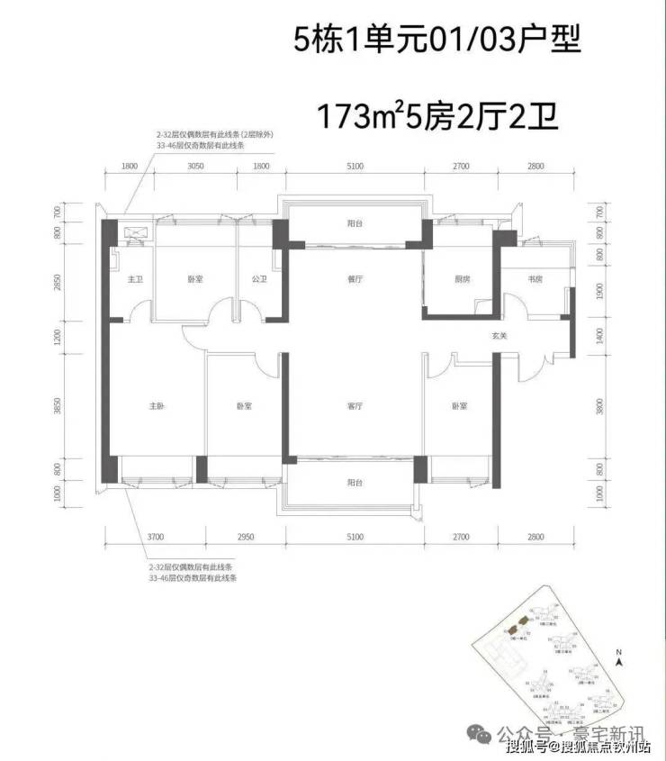 【五栋一单元-平面图】3梯3户,3条腿,分别是01、03号房户型约173㎡的5房2厅2卫、02号房户型约149㎡的5房2厅2卫