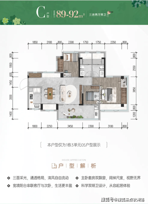 (2)89-92㎡三房两卫:分竖厅和横厅,全凸窗设计,竖厅可观会展河景;
