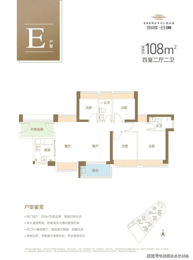 -108㎡4房2厅2卫:设计的是横厅南北通透格局,客餐6.2米开间,U型厨房,卫生间干湿分离,有额外赠送一大块入户花园,阳台主朝东南向,仅有2栋4单元03户型才有这个面积段户型。