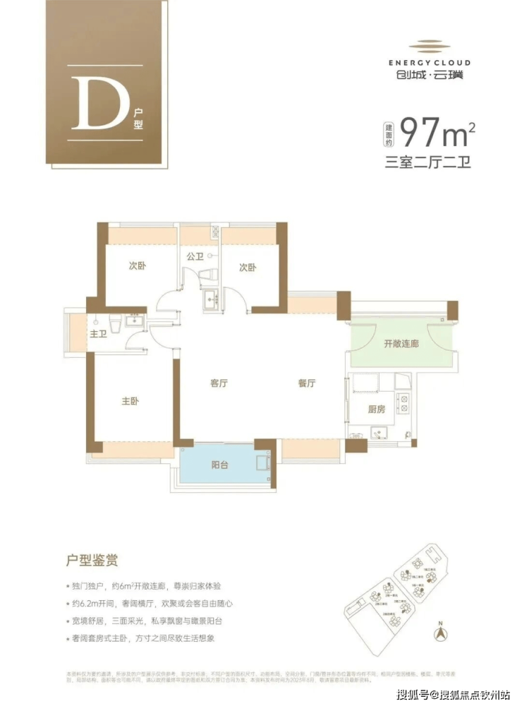 -97㎡3房2厅2卫:设计的是横厅南北通透格局,客餐厅6.2米开间,U型厨房,卫生间干湿分离,有额外赠送一大块入户花园,阳台主朝东南向。