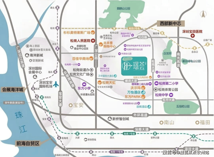 璟荟名庭项目所处的区位属于松岗老中心板块,周边的居住氛围非常浓厚,松岗目前最好的商业,如天虹商场,联投东方park、沃尔玛都是在这个区域,包括松岗最好的教育资源,松岗二小(距离约600米)、松岗中学(距离约1.5公里),其中2024年的中考状元就出自松岗中学。