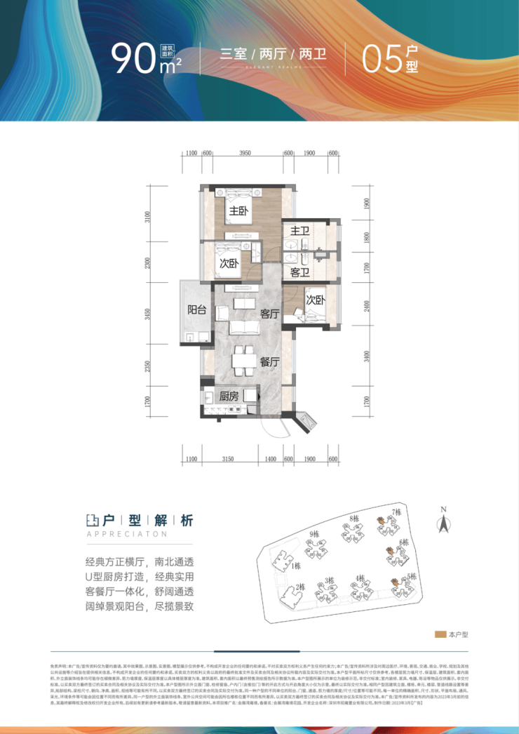 建面约110㎡ 4房2厅2卫:设阔尺度横厅打造,阔绰景观阳台,动静分区合理,U型厨房操作使用,居住舒适度高。