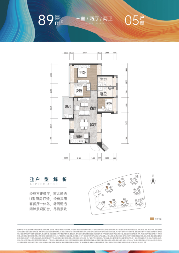 建面约89/90㎡ 3房2厅2卫(竖厅):南北通透3房,全凸窗设计,动静分区合理